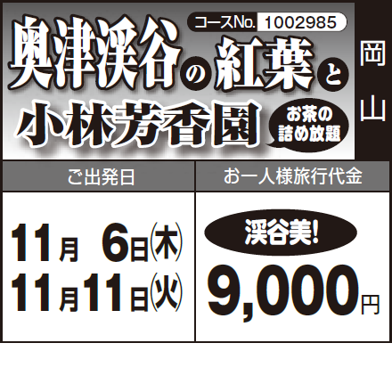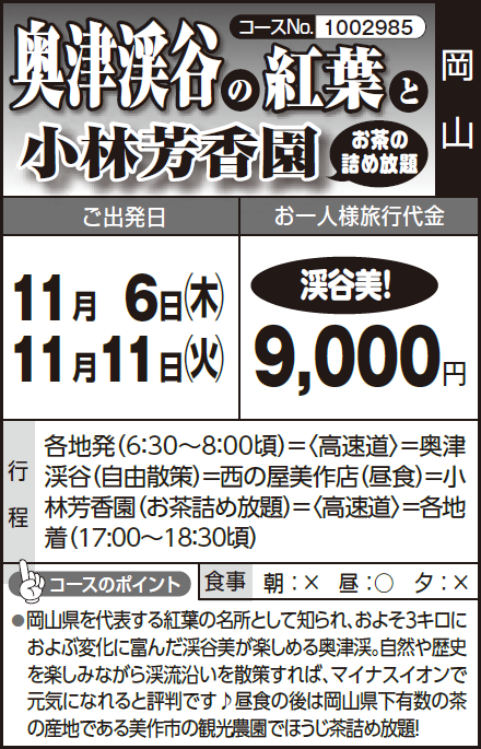 各地発(6:30~8:00頃)=〈高速道〉=奥津渓谷(自由散策)=西の屋美作店(昼食)=小林芳香園(お茶詰め放題)=〈高速道〉=各地着(17:00~18:30頃) |