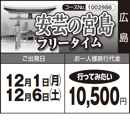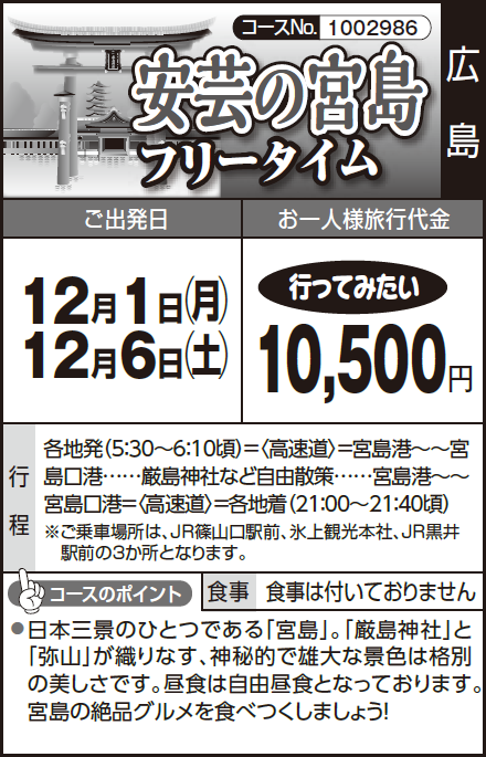 各地発(5:30~6:10頃)=〈高速道〉=宮島港~~宮島口港……厳島神社など自由散策……宮島港~~宮島口港=〈高速道〉=各地着(21:00~21:40頃)