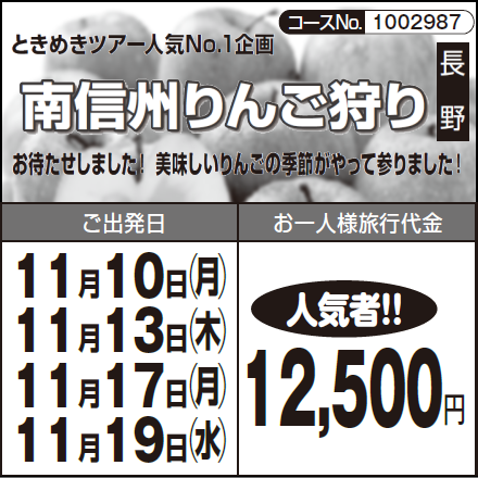 各地発(6:20~7:00頃)=〈高速道〉=飯田市内(昼食)=みなみ園りんご狩り=〈高速道〉※途中夕食タイム=各地着(20:00~20:40頃) |