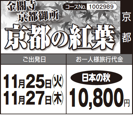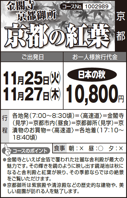 各地発(7:00~8:30頃)=〈高速道〉=金閣寺(見学)=京都市内(昼食)=京都御所(見学)=京漬物のお買物=〈高速道〉=各地着(17:10~18:40頃) |