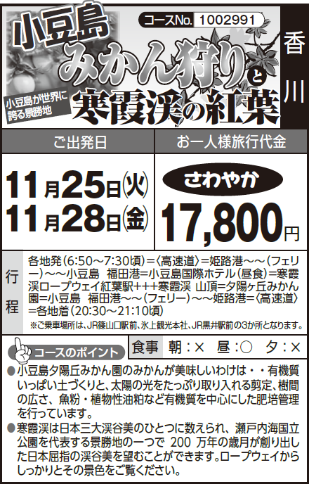 各地発(6:50~7:30頃)=〈高速道〉=姫路港~~(フェリー)~~小豆島 福田港=小豆島国際ホテル(昼食)=寒霞渓ロープウェイ紅葉駅+++寒霞渓 山頂=夕陽ヶ丘みかん園=小豆島 福田港~~(フェリー)~~姫路港=〈高速道〉=各地着(20:30~21:10頃)