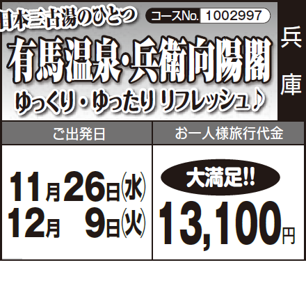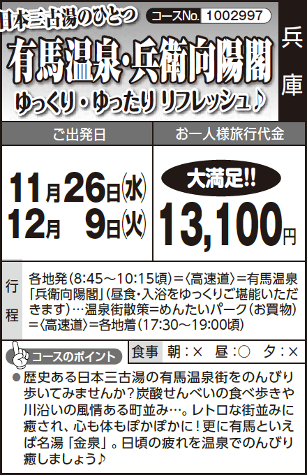 各地発(8:45~10:15頃)=〈高速道〉=有馬温泉「兵衛向陽閣」(昼食・入浴をゆっくりご堪能いただきます)…温泉街散策=めんたいパーク(お買物)=〈高速道〉=各地着(17:30~19:00頃)