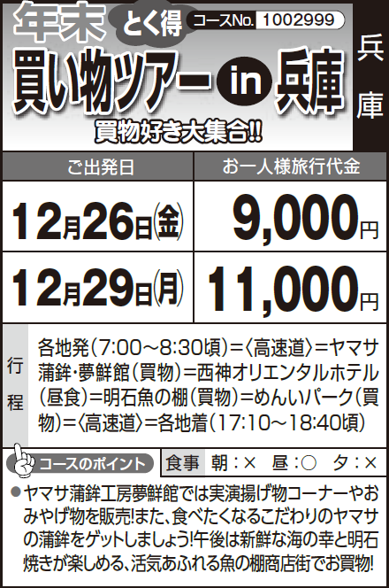 行 程 | 各地発(7:00~8:30頃)=〈高速道〉=ヤマサ蒲鉾・夢鮮館(買物)=西神オリエンタルホテル(昼食)=明石魚の棚(買物)=めんいパーク(買物)=〈高速道〉=各地着(17:10~18:40頃) |