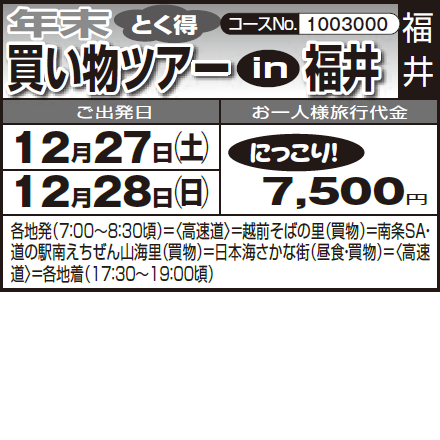 各地発(7:00~8:30頃)=〈高速道〉=越前そばの里(買物)=南条SA・道の駅南えちぜん山海里(買物)=日本海さかな街(昼食・買物)=〈高速道〉=各地着(17:30~19:00頃) |