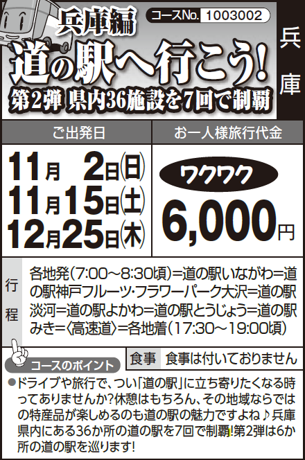 行 程 各地発(7:00~8:30頃)=道の駅いながわ=道の駅神戸フルーツ・フラワーパーク大沢=道の駅淡河=道の駅よかわ=道の駅とうじょう=道の駅みき=〈高速道〉=各地着(17:30~19:00頃)