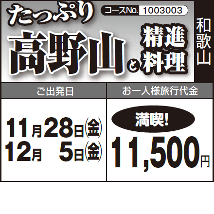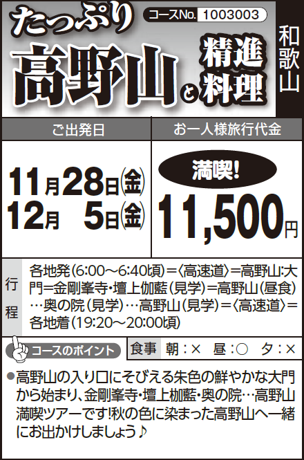 行 程 | 各地発(6:00~6:40頃)=〈高速道〉=高野山:大門=金剛峯寺・壇上伽藍(見学)=高野山(昼食)…奥の院(見学)…高野山(見学)=〈高速道〉=各地着(19:20~20:00頃) |