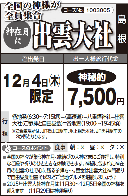 行 程 | 各地発(6:30~7:15頃)=〈高速道〉=八重垣神社=出雲大社(ご参拝と自由昼食)=各地着(19:00~19:45頃) |