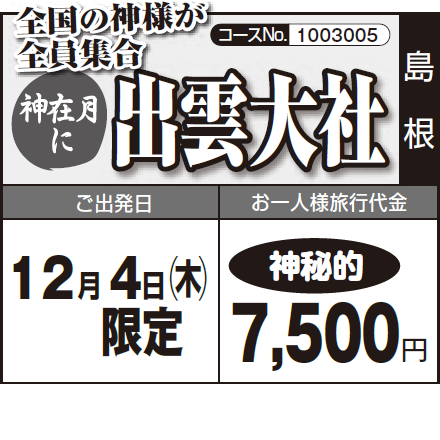- 全国の神々が集う神在月。縁結びの大神さまにご参拝し、特別なご縁や祈りのひとときを体験できます。神秘に包まれた神在月の出雲の社で心に残る参拝を…。昼食は出雲大社神門通りで自由昼食!出雲そばなどご当地グルメを堪能しましょう♪