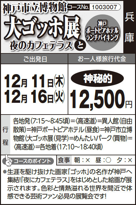 行 程 | 各地発(7:15~8:45頃)=〈高速道〉=異人館(自由散策)=神戸ポートピアホテル(昼食)=神戸市立博物館(大ゴッホ展(見学)=めんたいパーク(買物)=〈高速道〉=各地着(17:10~18:40頃) |