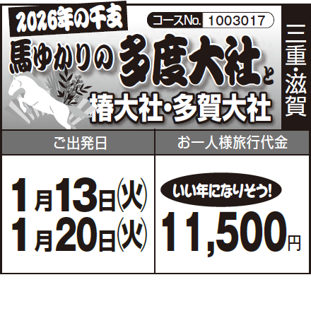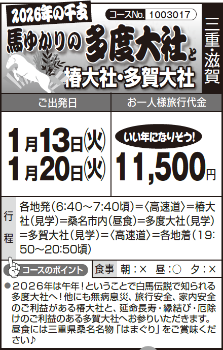 各地発(6:40~7:40頃)=〈高速道〉=椿大社(見学)=桑名市内(昼食)=多度大社(見学)=多賀大社(見学)=〈高速道〉=各地着(19:50~20:50頃) |