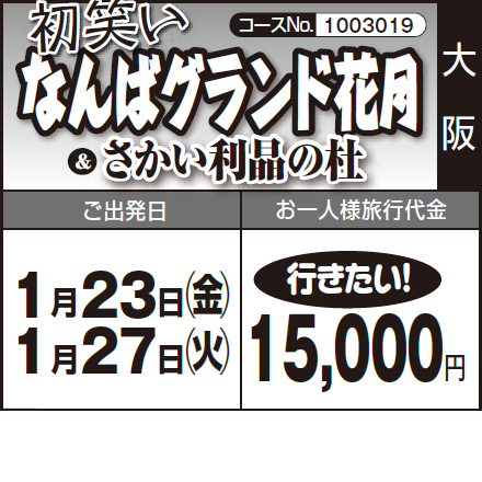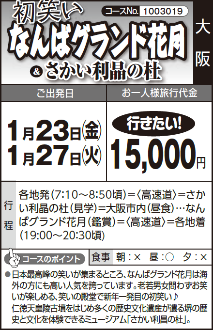 各地発(7:10~8:50頃)=〈高速道〉=さかい利晶の杜(見学)=大阪市内(昼食)…なんばグランド花月(鑑賞)=〈高速道〉=各地着(19:00~20:30頃)