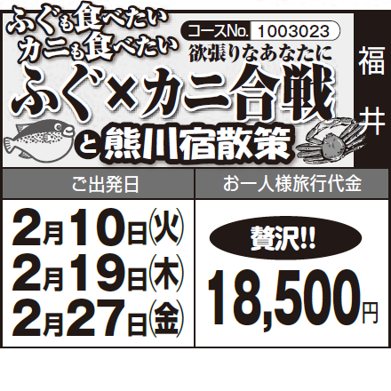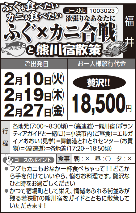 各地発(7:00~8:30頃)=〈高速道〉=熊川宿(ボランティアガイドと一緒に!)=小浜市内(ご昼食)=エルガイアおおい(見学)=舞鶴港とれとれセンター(お買物)=〈高速道〉=各地着(17:20~18:50頃) |