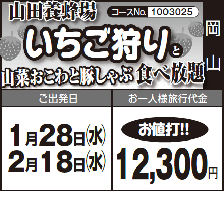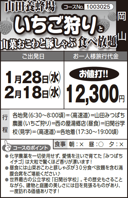 各地発(6:30~8:00頃)=〈高速道〉=山田みつばち農園(いちご狩り)=西の屋湯郷店(昼食)=旧閑谷学校(見学)=〈高速道〉=各地着(17:30~19:00頃)