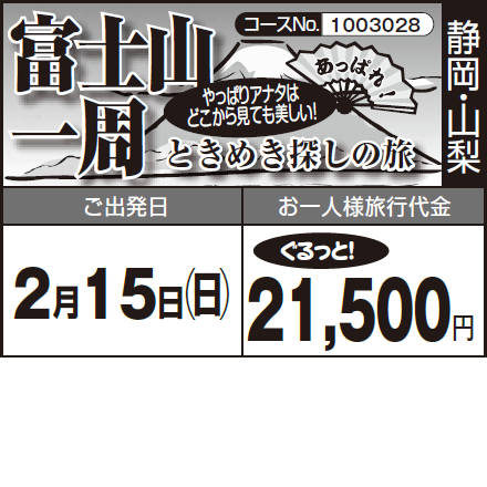 富士川SA(乗換え)=〈高速道〉=山中湖(見学)=忍野八海(見学)=河口湖(車窓)=本梄湖(見学)=朝霧高原(昼食)=白糸の滝(見学)=富士川SA(乗換え)=〈高速道〉=各地着(22:40~23:20頃)