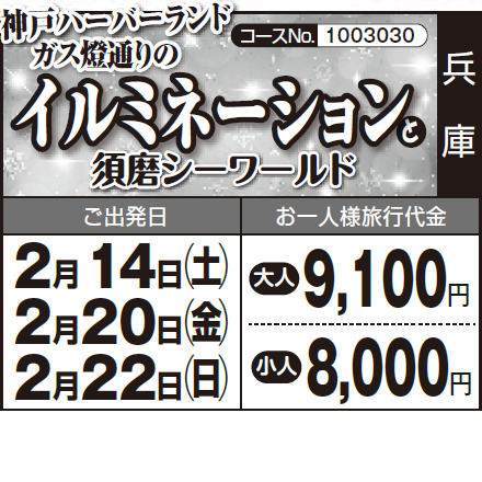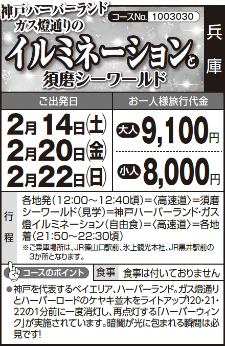 各地発(12:00~12:40頃)=〈高速道〉=須磨シーワールド(見学)=神戸ハーバーランド・ガス燈イルミネーション(自由食)=〈高速道〉=各地着(21:50~22:30頃) |