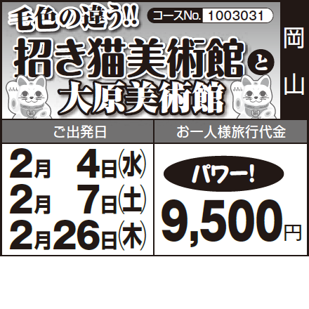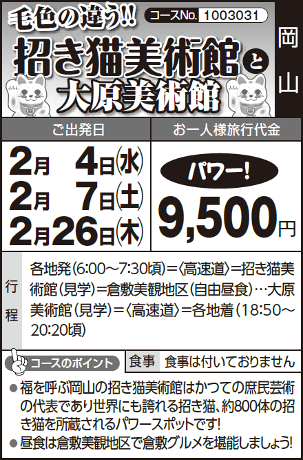 各地発(6:00~7:30頃)=〈高速道〉=招き猫美術館(見学)=倉敷美観地区(自由昼食)…大原美術館(見学)=〈高速道〉=各地着(18:50~20:20頃) |