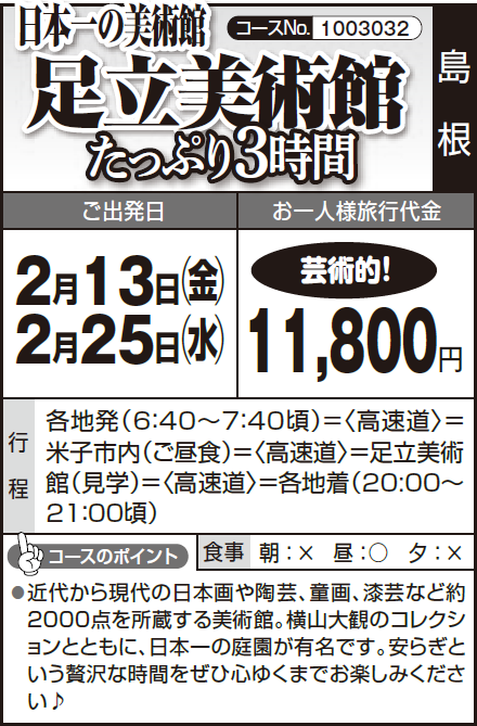 各地発(6:40~7:40頃)=〈高速道〉=米子市内(ご昼食)=〈高速道〉=足立美術館(見学)=〈高速道〉=各地着(20:00~21:00頃) |