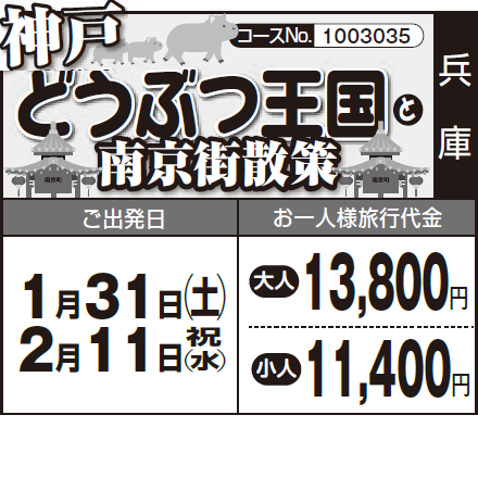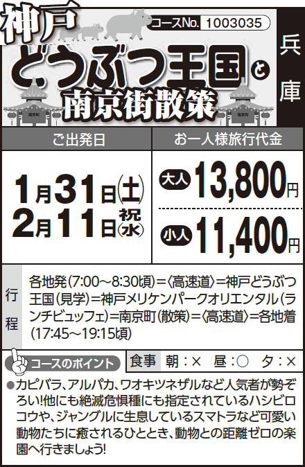 各地発(7:00~8:30頃)=〈高速道〉=神戸どうぶつ王国(見学)=神戸メリケンパークオリエンタル(ランチビュッフェ)=南京町(散策)=〈高速道〉=各地着(17:45~19:15頃) |