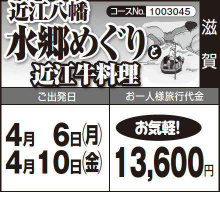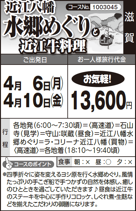 各地発(6:00~7:30頃)=〈高速道〉=石山寺(見学)=守山:咲蔵(昼食)=近江八幡水郷めぐり=ラ・コリーナ近江八幡(買物)=〈高速道〉=各地着(18:10~19:40頃) |
