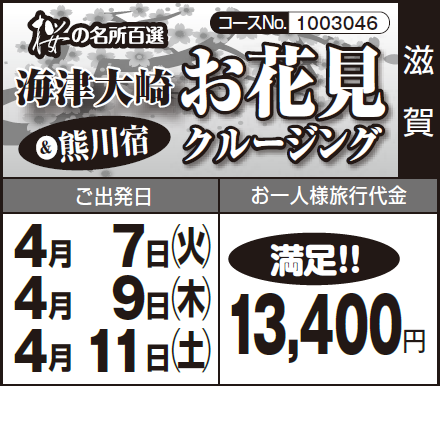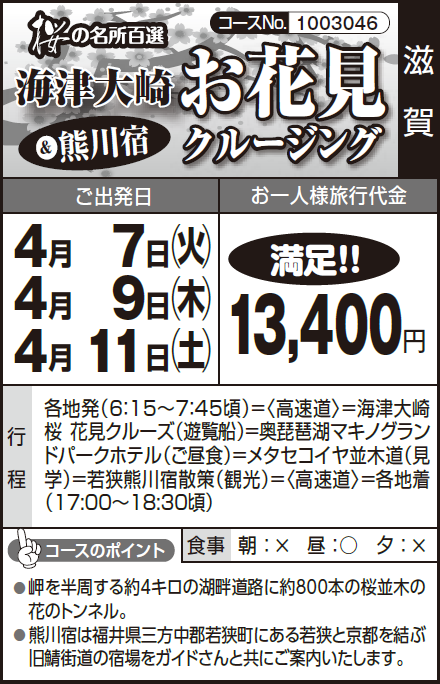 各地発(6:15~7:45頃)=〈高速道〉=海津大崎桜 花見クルーズ(遊覧船)=奥琵琶湖マキノグランドパークホテル(ご昼食)=メタセコイヤ並木道(見学)=若狭熊川宿散策(観光)=〈高速道〉=各地着(17:00~18:30頃) |