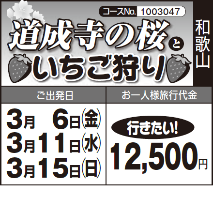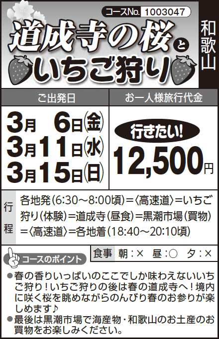 各地発(6:30~8:00頃)=〈高速道〉=いちご狩り(体験)=道成寺(昼食)=黒潮市場(買物)=〈高速道〉=各地着(18:40~20:10頃)