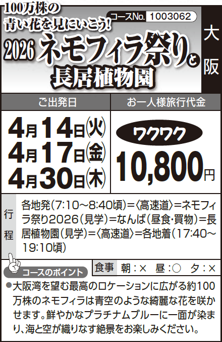 各地発(7:10~8:40頃)=〈高速道〉=ネモフィラ祭り2026(見学)=なんば(昼食・買物)=長居植物園(見学)=〈高速道〉=各地着(17:40~19:10頃) |
