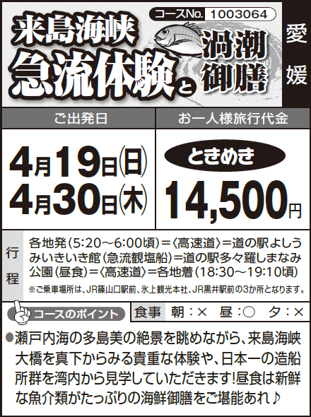 各地発(5:20~6:00頃)=〈高速道〉=道の駅よしうみいきいき館(急流観塩船)=道の駅多々羅しまなみ公園(昼食)=〈高速道〉=各地着(18:30~19:10頃) |