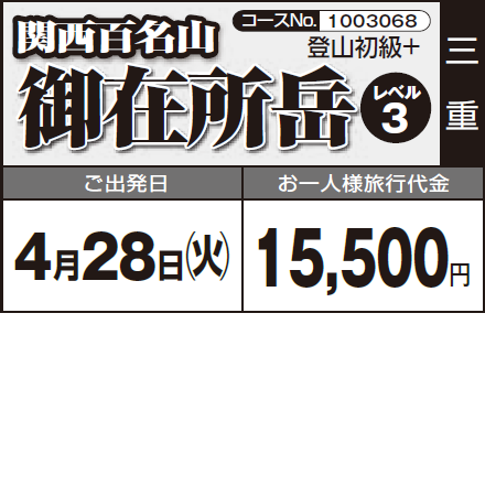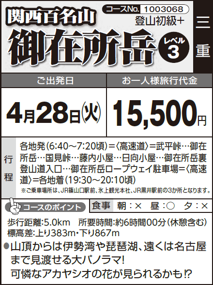 各地発(6:40~7:20頃)=〈高速道〉=武平峠…御在所岳…国見峠…藤内小屋…日向小屋…御在所岳裏登山道入口…御在所岳ロープウェイ駐車場=〈高速道〉=各地着(19:30~20:10頃) |
