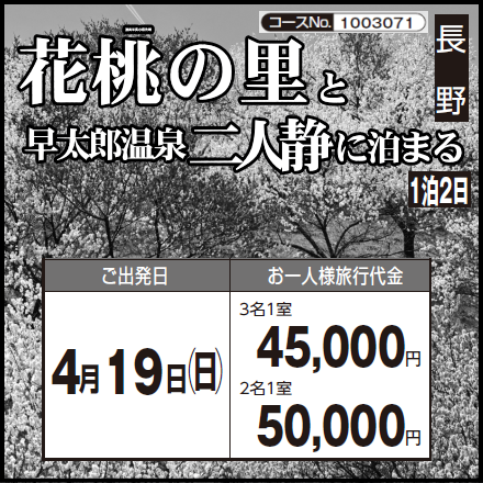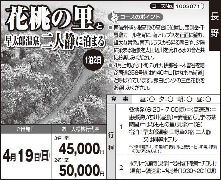 各地発(6:20~7:00頃)=〈高速道〉=恵那狭いち川(昼食)=妻籠宿(見学・お茶時間)=はなももの里(見学)=(泊) |