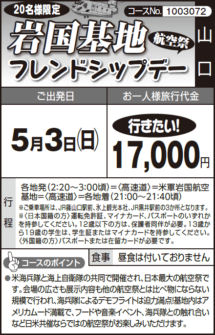 各地発(2:20~3:00頃)=〈高速道〉=米軍岩国航空基地=〈高速道〉=各地着(21:00~21:40頃) |