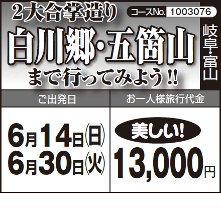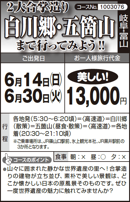 各地発(5:30~6:20頃)=〈高速道〉=白川郷(散策)=五箇山(昼食・散策)=〈高速道〉=各地着(20:30~21:10頃)