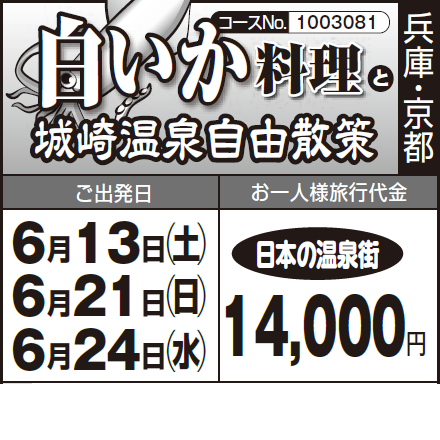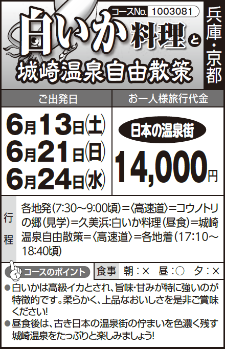 各地発(7:30~9:00頃)=〈高速道〉=コウノトリの郷(見学)=久美浜:白いか料理(昼食)=城崎温泉自由散策=〈高速道〉=各地着(17:10~18:40頃) |