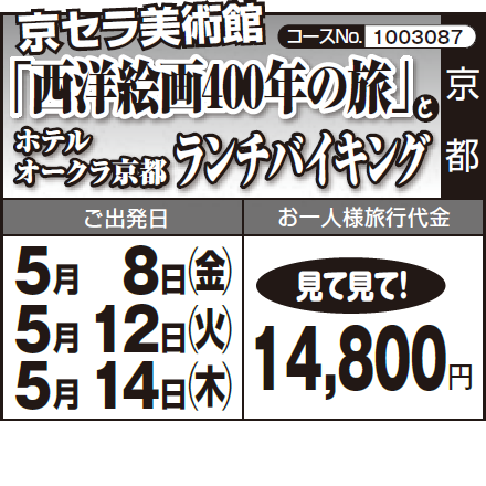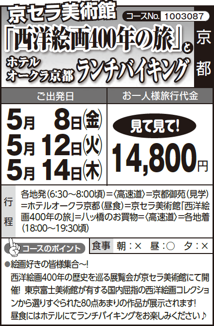 各地発(6:30~8:00頃)=〈高速道〉=京都御苑(見学)=ホテルオークラ京都(昼食)=京セラ美術館「西洋絵画400年の旅」=八ッ橋のお買物=〈高速道〉=各地着(18:00~19:30頃) |