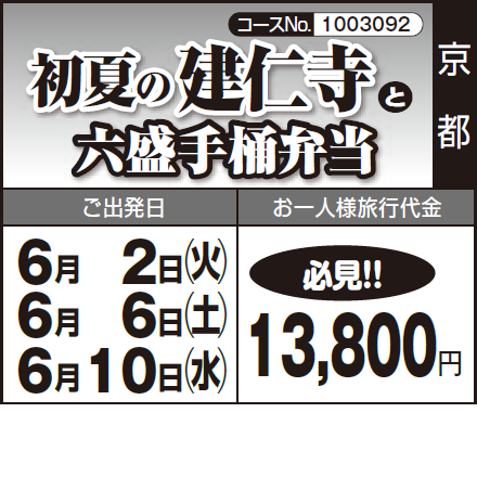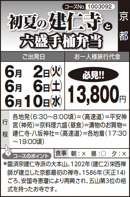 各地発(6:30~8:00頃)=〈高速道〉=平安神宮(神苑)=京料理六盛(昼食)=漬物のお買物=建仁寺・八坂神社=〈高速道〉=各地着(17:30~19:00頃) |