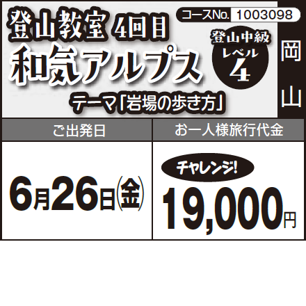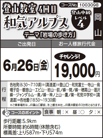 各地発(6:30~7:10頃)=〈高速道〉=登山口…和気富士…寺山…烏帽子岳…観音山…エビ山…岩山…前ノ峰…間ノ峰…穂高山…涸沢峰…ジャンダルム…奥ノ峰…神ノ上山…鷹ノ巣…和気中学校=〈高速道〉=各地着(18:50~19:30頃) |
