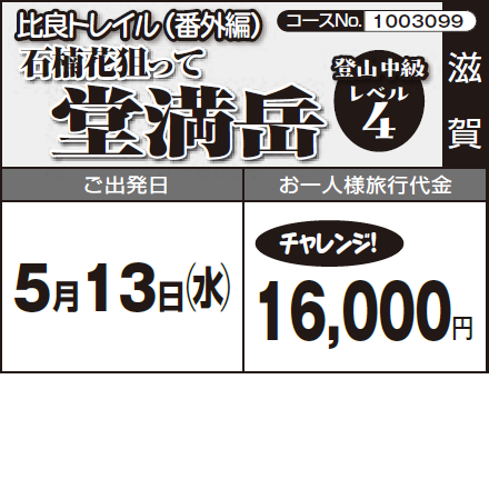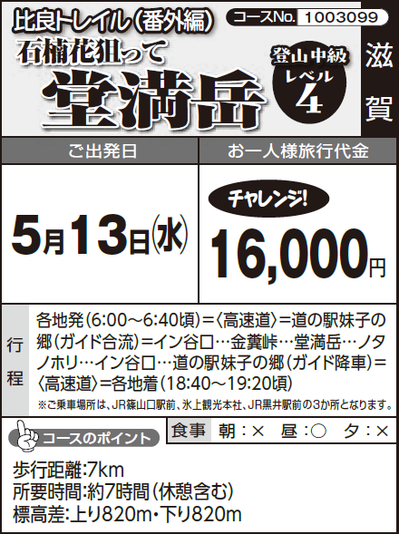 各地発(6:00~6:40頃)=〈高速道〉=道の駅妹子の郷(ガイド合流)=イン谷口…金糞峠…堂満岳…ノタノホリ…イン谷口…道の駅妹子の郷(ガイド降車)=〈高速道〉=各地着(18:40~19:20頃) |