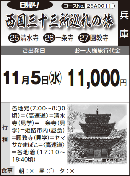 【日程・出発場所】行 程 | 各地発(7:00~8:30頃)=〈高速道〉=清水寺(見学)=一条寺(見学)=姫路市内(昼食)=圓教寺(見学)=ヤマサかまぼこ=〈高速道〉=各地着( 1 7:1 0 ~18:40頃) |