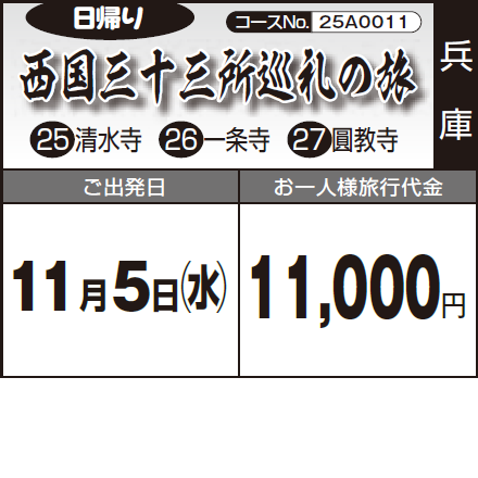 行 程 | 各地発(7:00~8:30頃)=〈高速道〉=清水寺(見学)=一条寺(見学)=姫路市内(昼食)=圓教寺(見学)=ヤマサかまぼこ=〈高速道〉=各地着( 1 7:1 0 ~18:40頃) |
