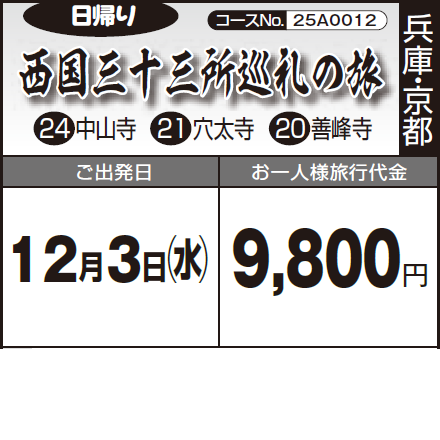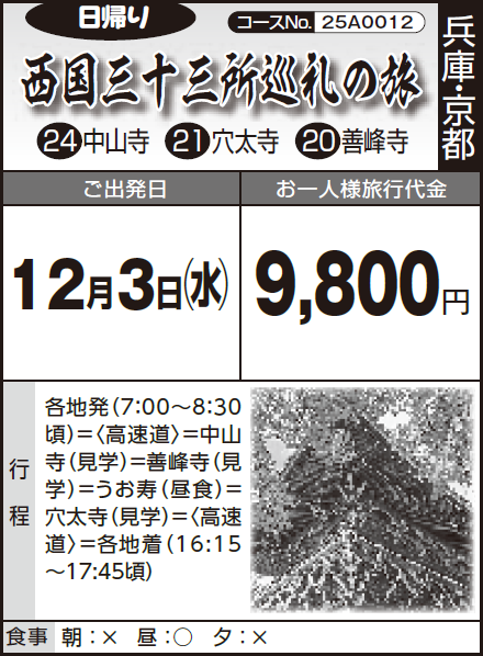 【日程・出発場所】行 程 | 各地発(7:00~8:30頃)=〈高速道〉=中山寺(見学)=善峰寺(見学)=うお寿(昼食)=穴太寺(見学)=〈高速道〉=各地着(16:15~17:45頃) |